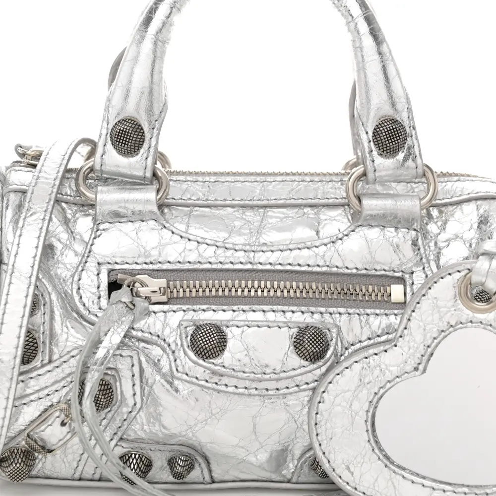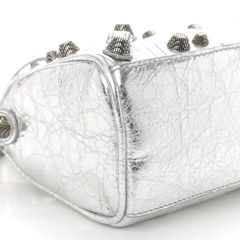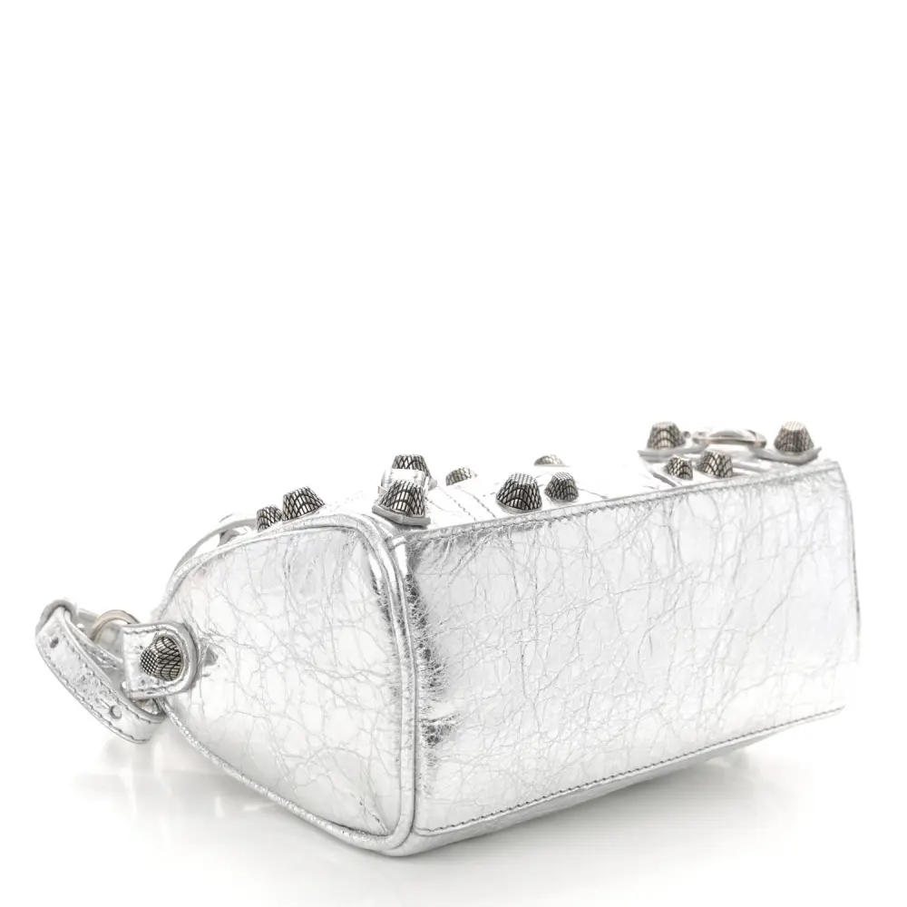 BALENCIAGA CRYSTAL NEO NANO CAGOLE HANDBAG SILVER AGNEAU ARENA LEATHER SILVER HARDWARE