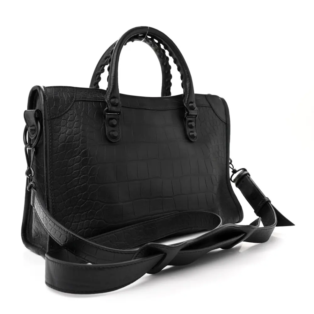 BALENCIAGA S CITY CLASSIC BLACK CROCODILE EMBOSSED MATTE SUPPLE LAMBSKIN LEATHER INCOGNITO HARDWARE
