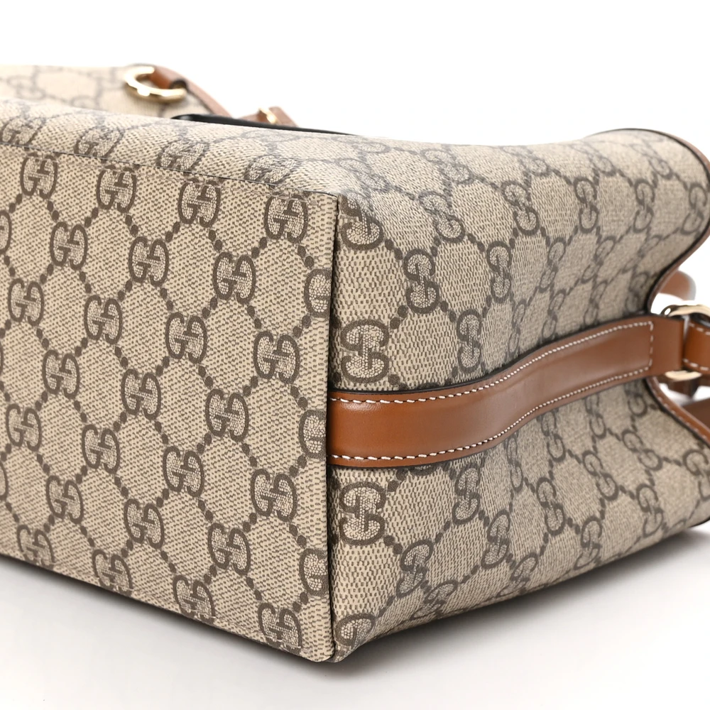 GUCCI SMALL EMBLEM TOTE BEIGE / DARK BROWN GG SUPREME MONOGRAM COATED CANVAS & LEATHER SILVER HARDWARE