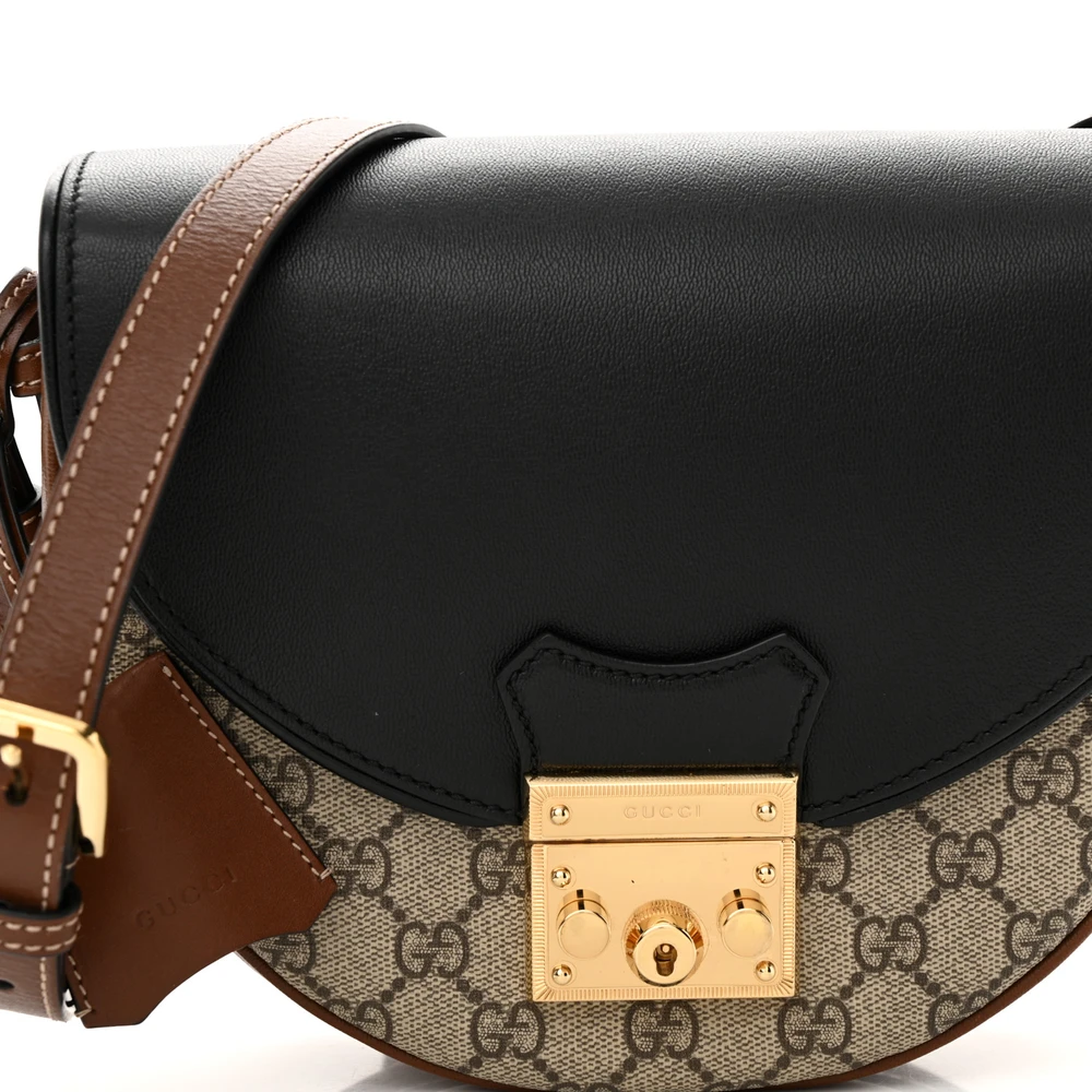 GUCCI SMALL PADLOCK MESSENGER SHOULDER BAG BEIGE/BLACK GG SUPREME MONOGRAM CANVAS & CALFSKIN LEATHER GOLD HARDWARE