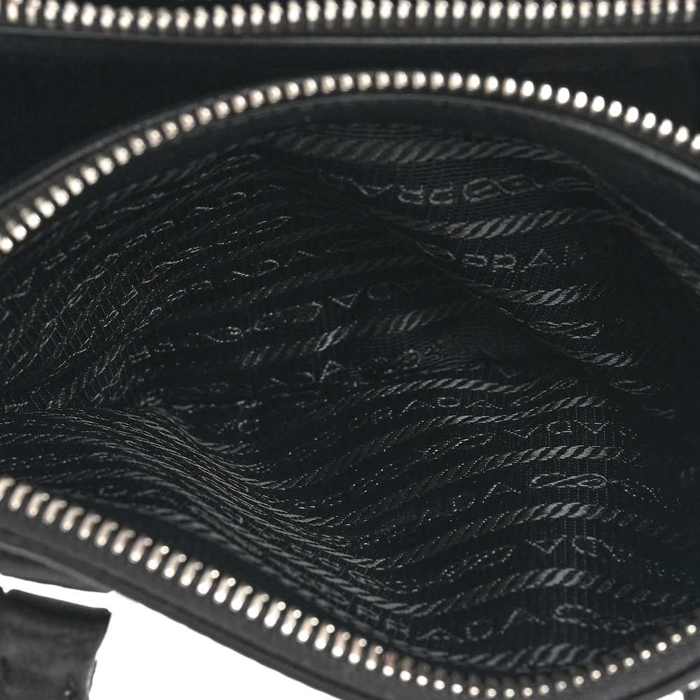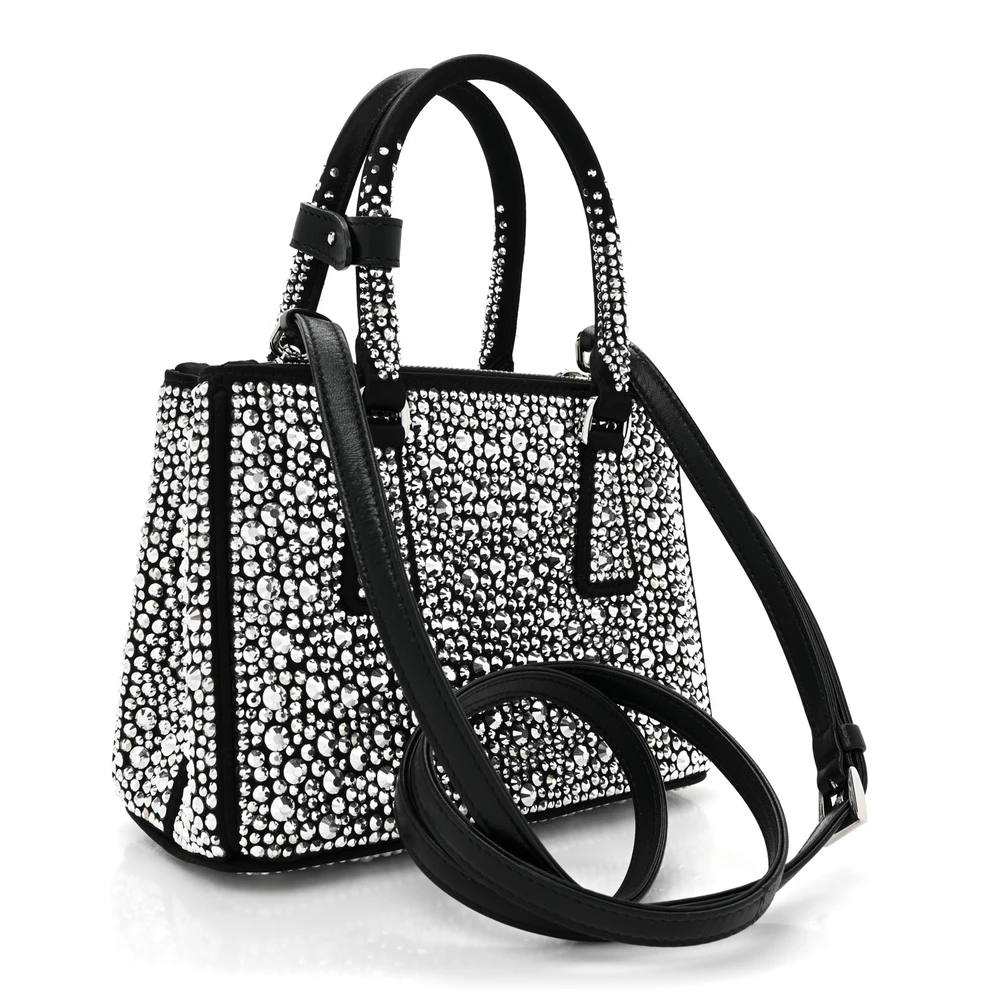 PRADA MINI GALLERIA DOUBLE ZIP TOTE BLACK METAL SATIN & CRYSTAL SILVER HARDWARE