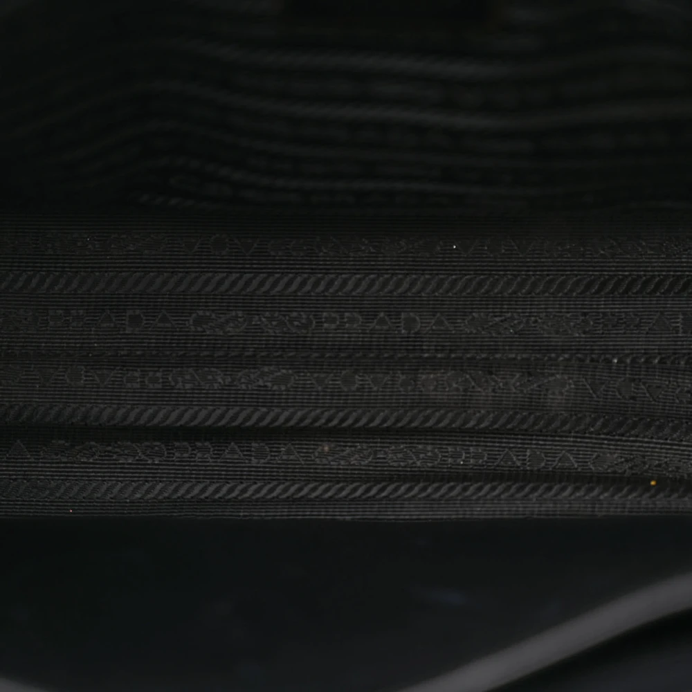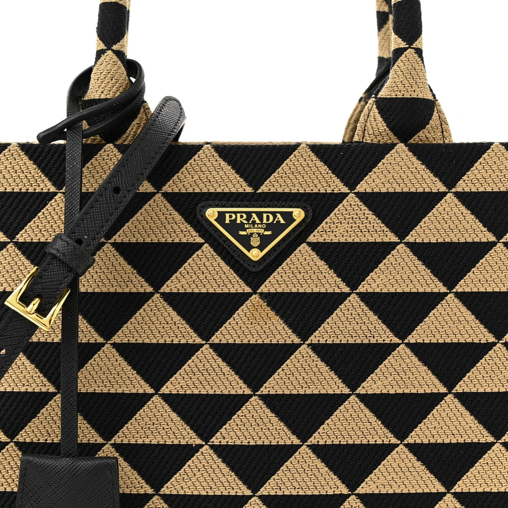 PRADA SMALL TRIANGOLO SYMBOLE EMBROIDERED TOTE BLACK AND CORDA JACQUARD SAFFIANO LEATHER GOLD HARDWARE