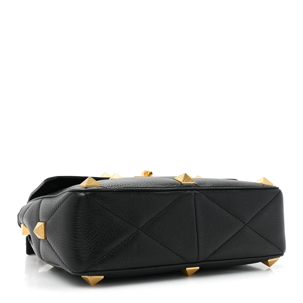 VALENTINO GARAVANI LARGE ROMAN STUD SHOULDER BAG BLACK GRAINED CALFSKIN LEATHER BRASS HARDWARE