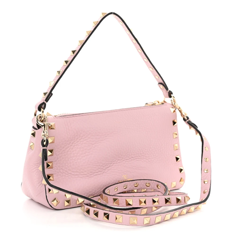 VALENTINO GARAVANI SMALL ROCKSTUD FLIP LOCK SHOULDER BAG WATER ROSE PEBBLED CALFSKIN LEATHER GOLD HARDWARE